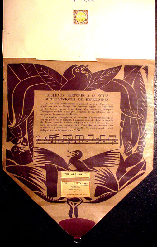 One visual difference between the earlier Pleyel rolls and the Aeolian-Pleyel example shown here is that the former just had white leaders with conventional labels, while French Aeolian attached an Art Deco leader with stylized 'bird' motifs. The French text explains the differences between ARRANGED and HAND-PLAYED Rolls, showing that baloney in this field was served up equally on both sides of the Atlantic. When playing the HAND-PLAYED roll (which BALLET MECANIQUE could never be in music roll form!) one is told to set the Tempo Lever at "70" and that all the phrasing nuances will be automatically registered by the player action. Fooey! Just beyond this leader appears Tempo "85" which the roll states should be maintained until the end. Fine, but to keep this 8½ feet-per-minute tempo running, the Pianolist must readjust the settings frequently. This means that the performer will make use of the Tempo Lever after all.