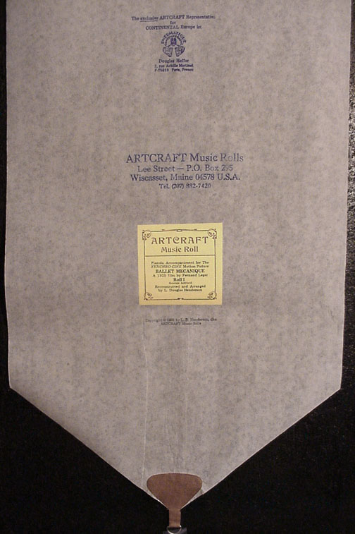 The ARTCRAFT Music Roll Set of 3 rolls, approximately 250 feet in length when combined, runs the projection time of the motion picture in its original form, and ... recent evidence has surfaced which indicates that there might have been 2 movies made in the 1924-1926 period of BALLET MECANIQUE being a Pianola+film experimental project. The key word is "experimental" since both the score and the motion picture were changed frequently, whereas the 1925 rolls by the Pleyel Piano Co. remained "fixed" in their perforated presentation. Thus, it wasn't long before the audio and the visual aspects of this combined effort between artist Fernand Léger and composer George Antheil went a different direction from photographer Dudley Murphy, artist Man Ray and others involved in these early Salon presentations. Hemingway discussed with the Murphys that the movie was supposed to have (quote) "French toughs and goggled industrial workers with steel girders" and the like ... something quite different from the truncated 'party' film of trick photography which exists today!