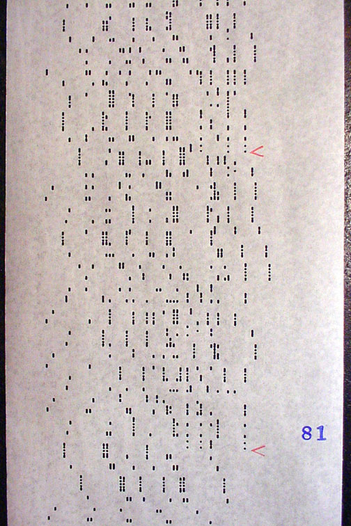 Again, notice how "TIME SPACE" #81 contains elements from the prior photograph of #80 ... but features a lot of superimposed staccato figurations, the first two of which are highlighted by the red accent mark ("<"). Later on we'll show you an example of the original Pleyel music roll arrangement, made from the composer's manuscript, and you'll see that these additional effects are buried in the arrangement, by comparison. What emerges as a sparkling addition to the musical texture on the ARTCRAFT Interpretive Arrangement of today was in 1925 a muddy performance characteristic, in which the extra notes are "lost" in the maze of overlapping notes. Graduated perforations allow the modern arranger to "direct one's attention" to various portions of the piano scale. This means that the added staccato notes, and the themes which follow, truly announce themselves ... as if another instrument (or machine) were contributing to the 'mechanical show'.